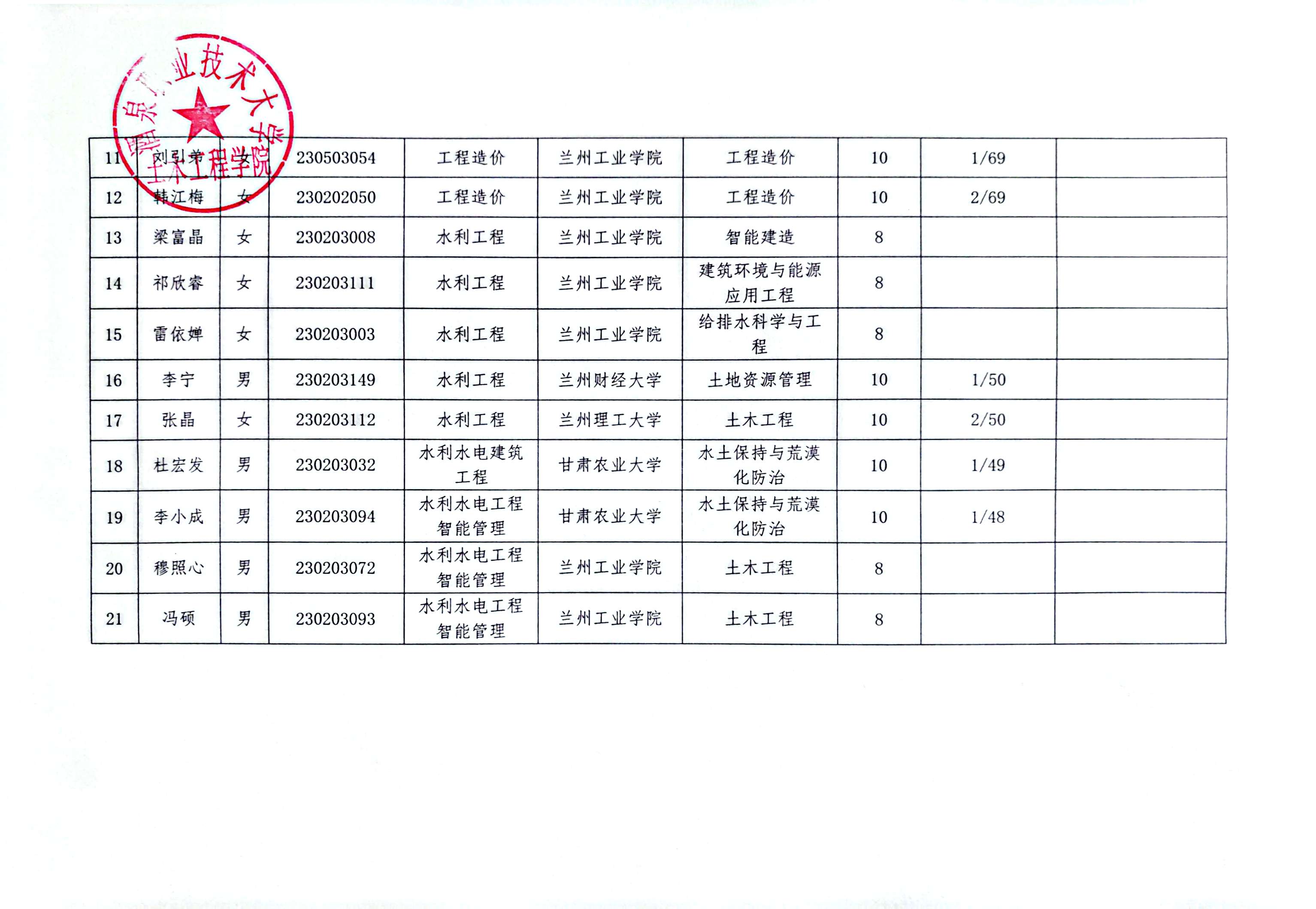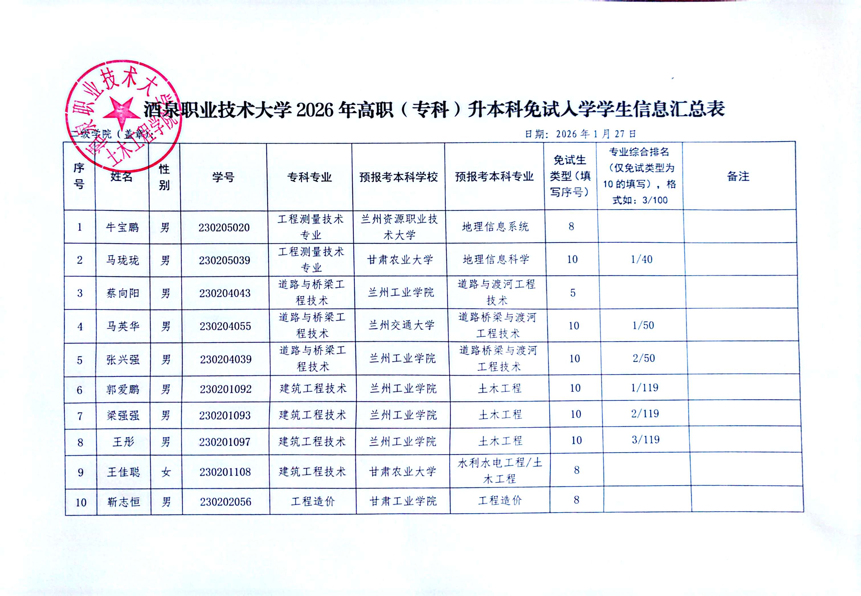 酒泉职业技术大学土木工程学院2026年高职(专科)升本科免试人学学生名单公示
