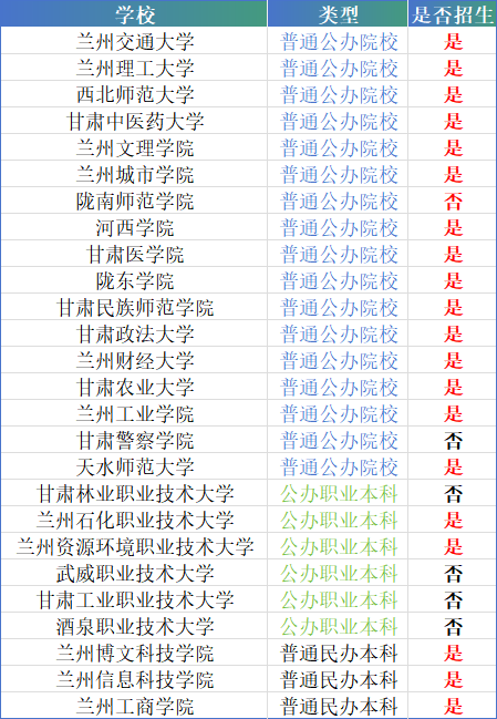 2026 年甘肃专升本考试的招生院校涵盖了多种类型,既有公办院校也有民办院校,且不同院校在招生参与情况上存在差异。